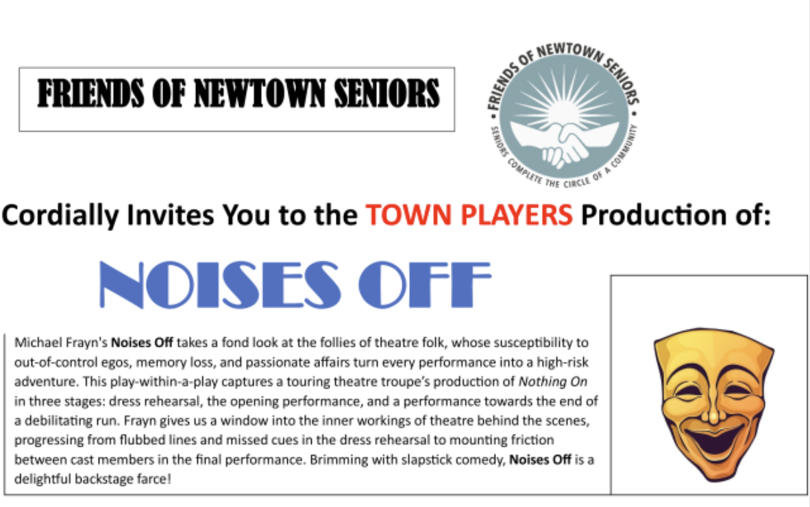 Tickets are $25 (with $5 senior discount). Order your tickets online at newtownplayers.org. (You will be directed to showclix.com). Select NOISES OFF, select Tickets and the March 30th 2:00 performance and Continue. ADD (+) number of general admission tickets requested and enter promo code: FONS_2025. COMPLETE ORDER. Print a copy for your records.